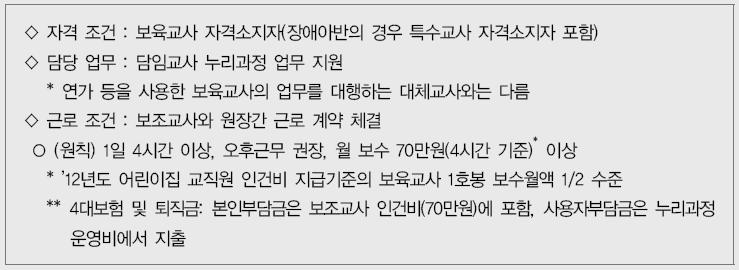 2014년도 보육사업안내의 '누리과정 보조교사'관련 부분을 첨부하오니 참고하시기 바랍니다.