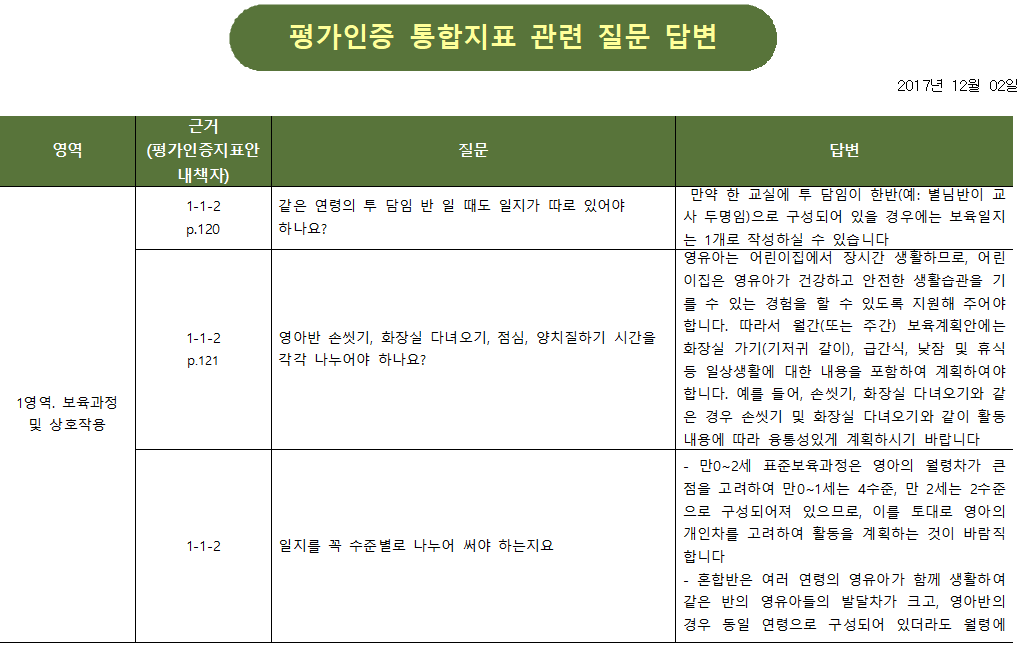 12월 2일에 진행 된 어린이집 평가인증 통합지표교육 시 나온 질의사항입니다.