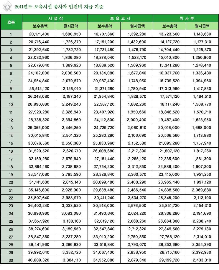 2011년 어린이집 보육교직원 인건비 지급 기준은 다음과 같으며 본인 호봉에 따라 확인하시기 바랍니다.