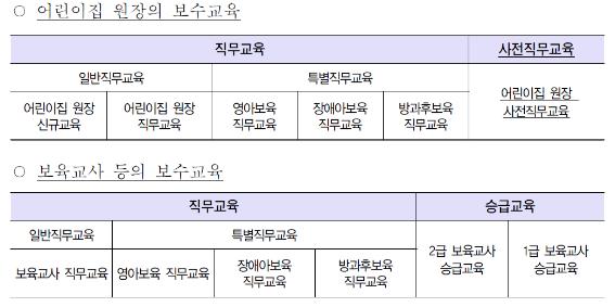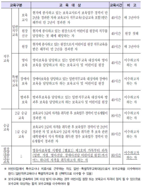 ○ 보육교직원의 자질향상을 위해 실시하는 교육으로써, 보육에 필요한 지식과 능력을 유지․개발하기 위하여 보육교직원이 정기적으로 받는 직무교육과 보육교사가 상위 등급의 자격(3급 → 2급, 2급 → 1급)을 취득하기 위해 받아야 하는 승급교육 및 어린이집 원장의 자격을 갖추기 위하여 받아야 하는