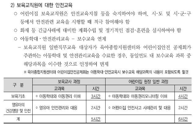<< 아동학대예방교육 >> [아동복지법] 제26조(아동학대신고의무자에 대한 교육) 관계 중앙행정기관의 장은 「아동학대범죄의 처벌등에 관한 특례법」 제10조제2항 각 호의 어느 하나에 해당하는 사람의 자격 취득 과정이나 보수교육과정에 아동학대 예방 및 신고의무와 관련된 교육 내용을 포함하도록 하여야 한다. -「영유아보육법」제10조에 따른 어린이집의 원장 등 보육교직원 [아동복지법 시행규칙] 제14조(신고의무자에 대한 교육 내용 등) ① 법 제26조제1항에 따른 아동학대 예방 및 신고의무와 관련된 교육에는 다음 각 호의 사항이 포함되 어야 한다. 1. 아동학대 예방 및 신고의무에 관한 법령 2. 아동학대 발견 시 신고 요령 3. 피해아동 보호 절차 ② 관계 중앙행정기관의 장은 법 제25조제2항 각 호의 신고의무자의 자격 취득 과정이나 보수교육 과 정에 아동학대 예방 및 신고의무와 관련된 교육을 1시간 이상 포함시켜야 한다. ③ 제1항에 따른 교육은 집합 교육 또는 인터넷 강의 등을 활용할 수 있다.