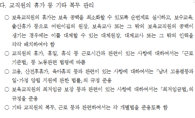 따라서, 보육교직원도 근로기준법에 따라 1일 8시간 근무, 1시간의 휴게시간이 주어집니다.